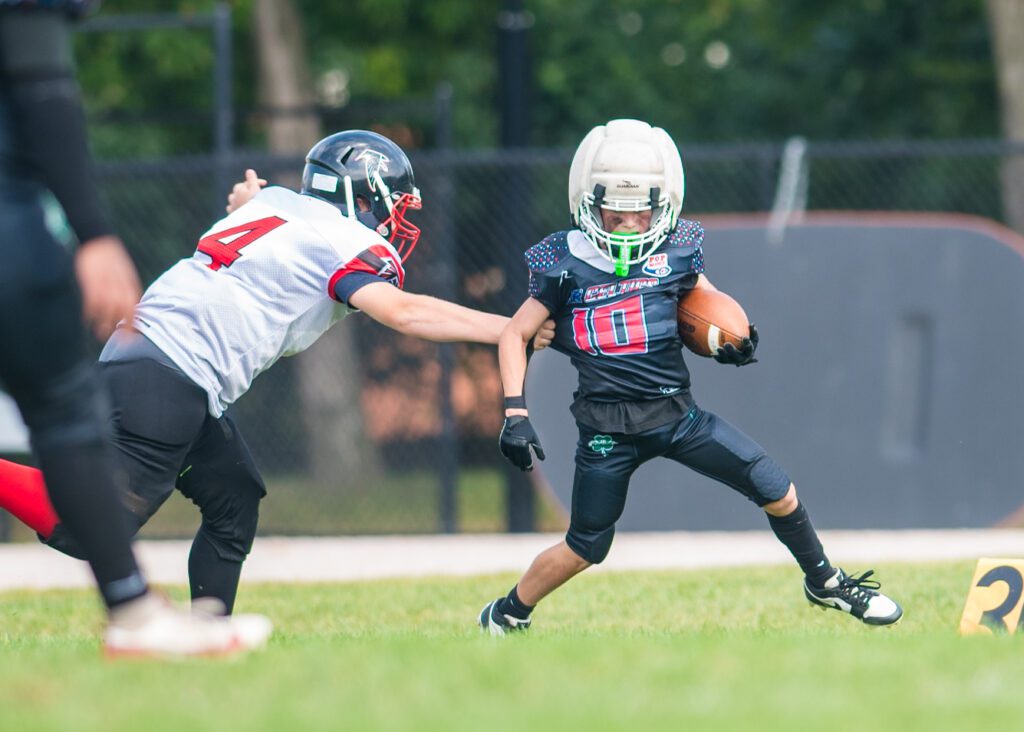Late in the second quarter, the Jr. Celtics took over possession in a scoreless game with 34.4 left in the quarter. The Jr. Celtics ran the ball for 4 yards on the first play, not showing much urgency on offense. But then, like the third-quarter rainstorm, lightning struck but in the form of Jr. Celtics Neyland Robinson. The diminutive Robinson is fast, elusive and possesses next-level cutback moves, which he put on display on second down. Robinson took a handoff, burst outside to the right and darted 77 yards for a touchdown, shocking the crowd and players from both sides.