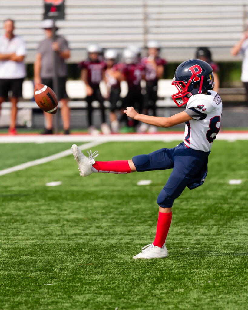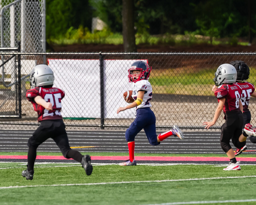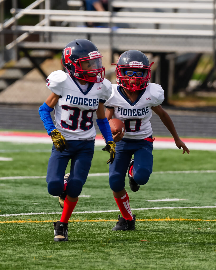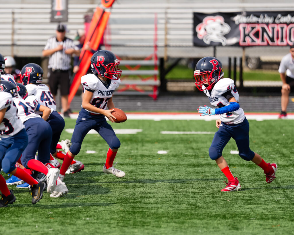 After the Pioneers opening series ended with a punt, the host Jr. Knights went on a 13-play drive. Meticulously they drove behind their center and guards. Play after play, chunk after chunk, the Jr. Knight plowed the middle of the road, gaining four to five yards on every play. Occasionally they experimented outside the tackle box but for the most part, the Pioneers couldn’t stop the power set by the Jr. Knights offensive line.