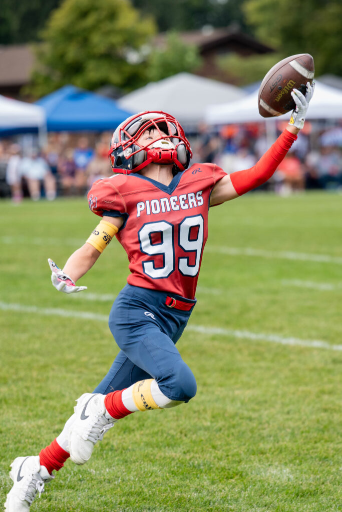 A 19-yard completion from Connor Kvelland to Krokos gave hope to the Pioneers next series but three plays later, going to the air again turned into a mistake as a throw was too short and easily intercepted by the Bulldogs.