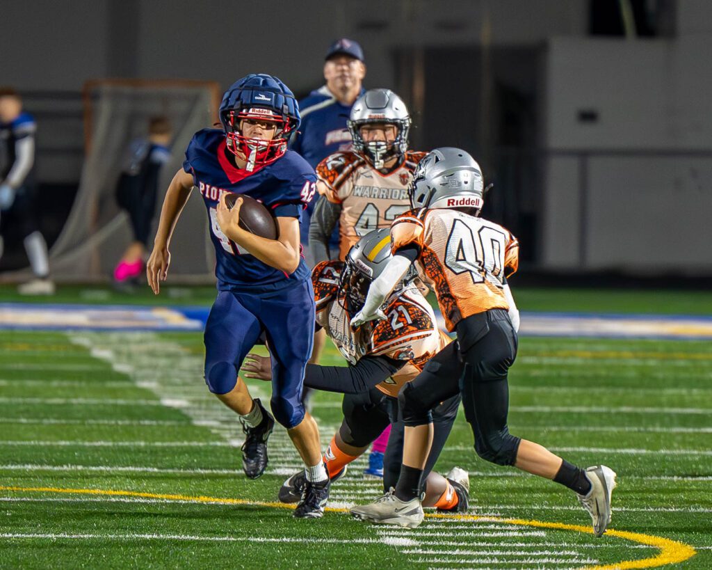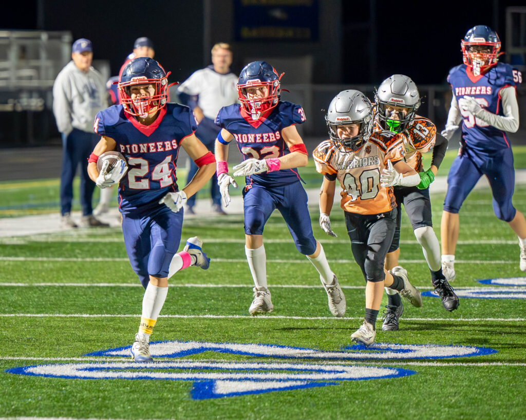 With ideal field position, the Pioneers put the game out of reach with a dazzling 35-yard touchdown run down the right sideline by Burgert with 7:42 remaining.