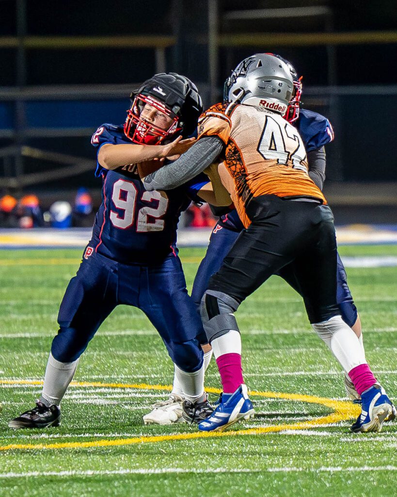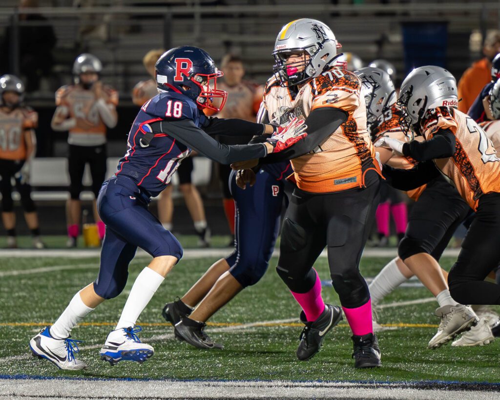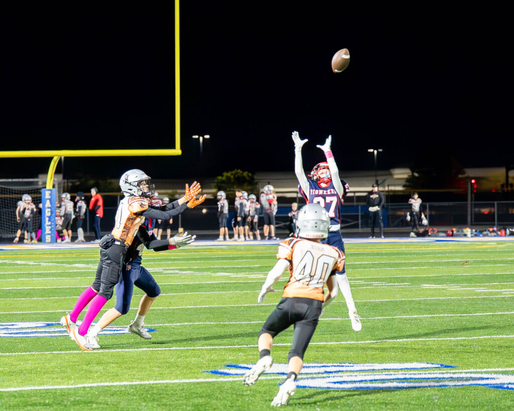 Arceo’s 12-yard sack set the stage for a three-touchdown explosion in the 22-0 victory over the New Lenox Jr Warriors in the semifinals of the Wednesday Night Football League at Sandburg High School on October 9.