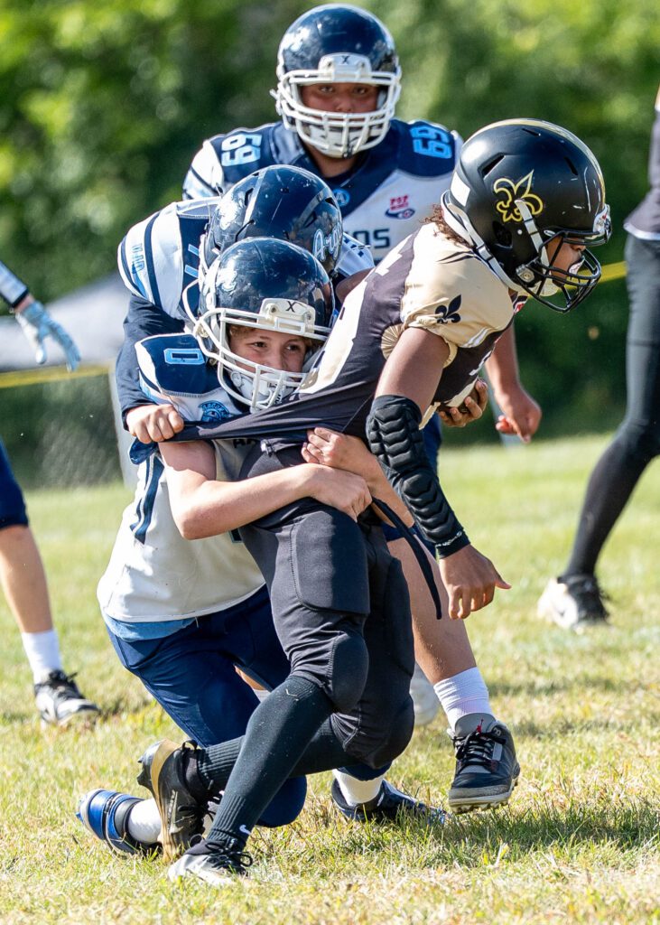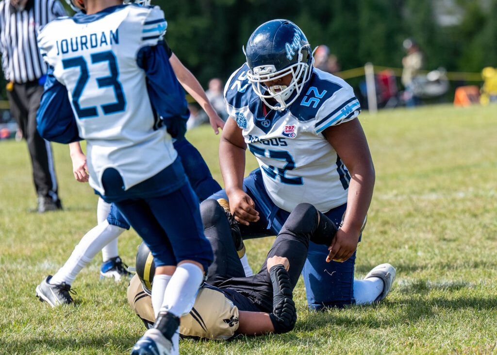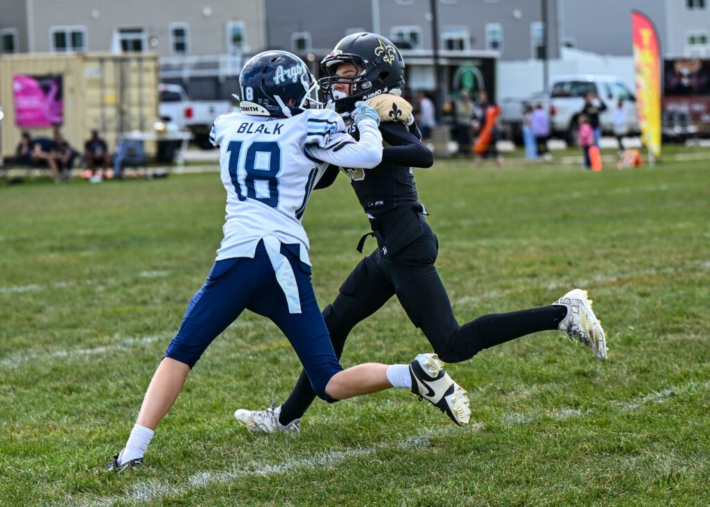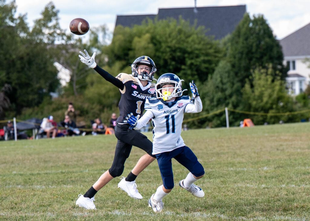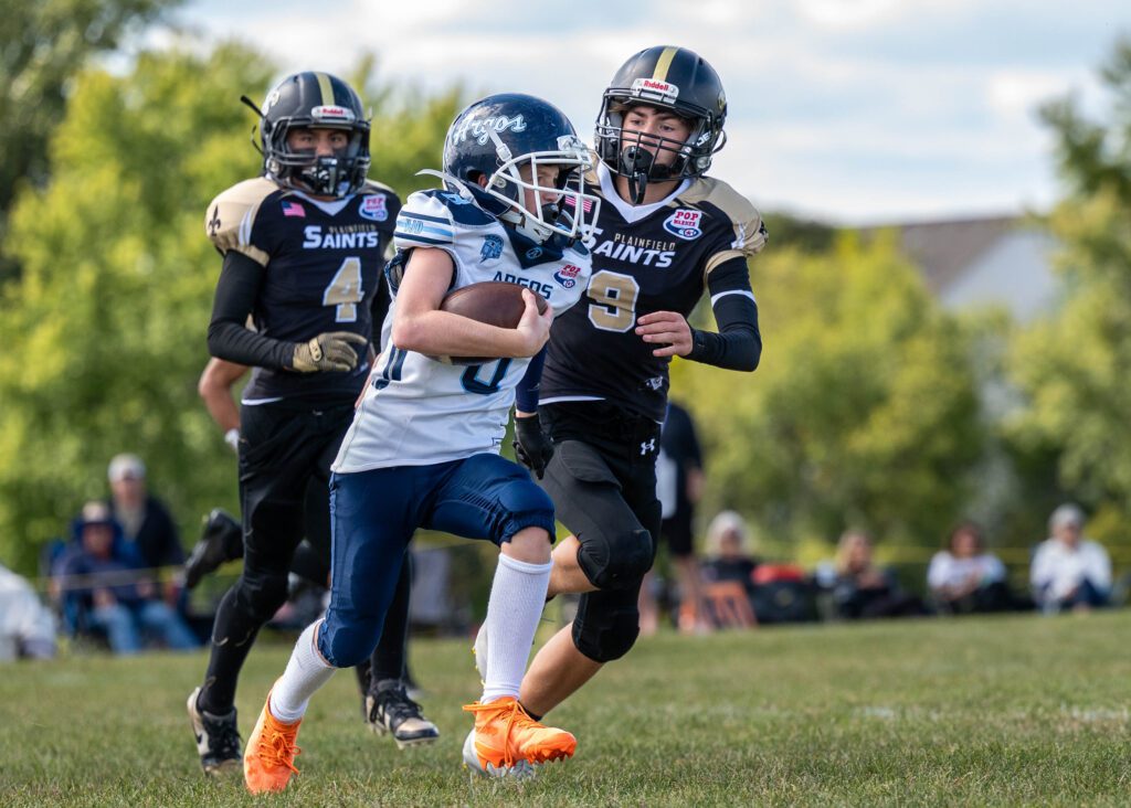 The Argos certainly did have a rough first half, allowing the Saints to chew up big chunks of yards and giving up several long touchdown runs. The Saints relied on their massive interior size advantage on the offensive line, combined with a pair of strong and fast running backs, to overpower the Argos on the plush grass field in Division II Pop Warner football.
