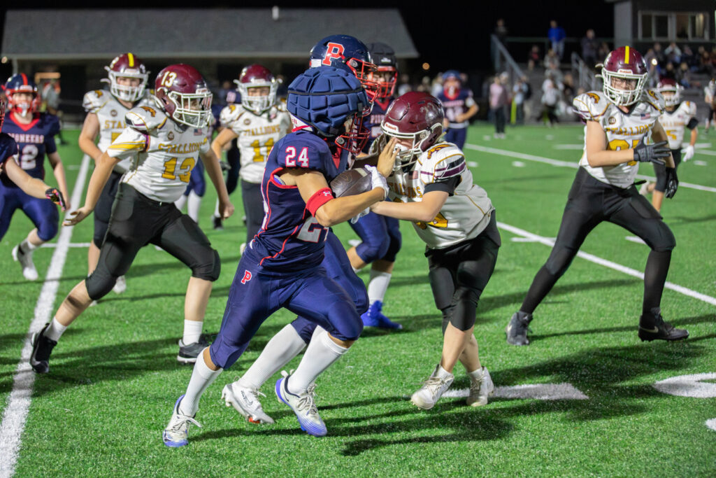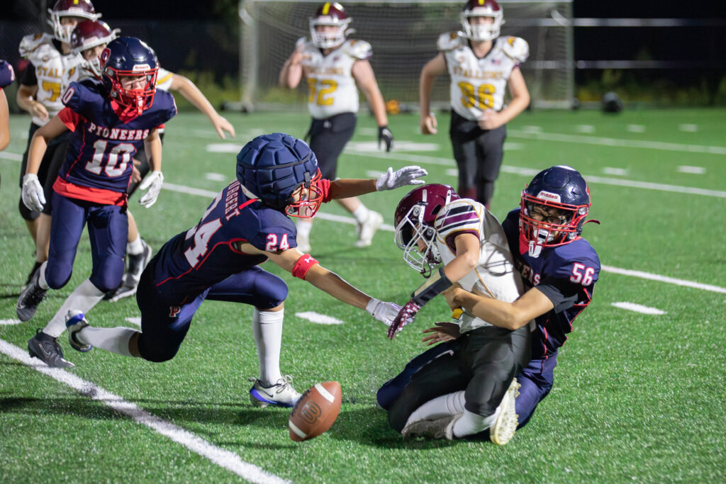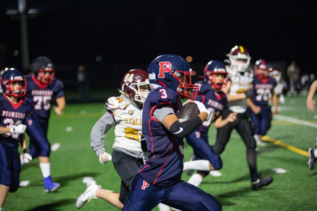 The Homer drive continued into the fourth quarter with the Pioneers using eveyone eligible to play. Sitting at the Pioneers 2 yard-line, the Stallions completed a pass to a back who then fumbled on contact which was recovered just outside the endzone by the Pioneers, ending Homer’s 15-play drive.