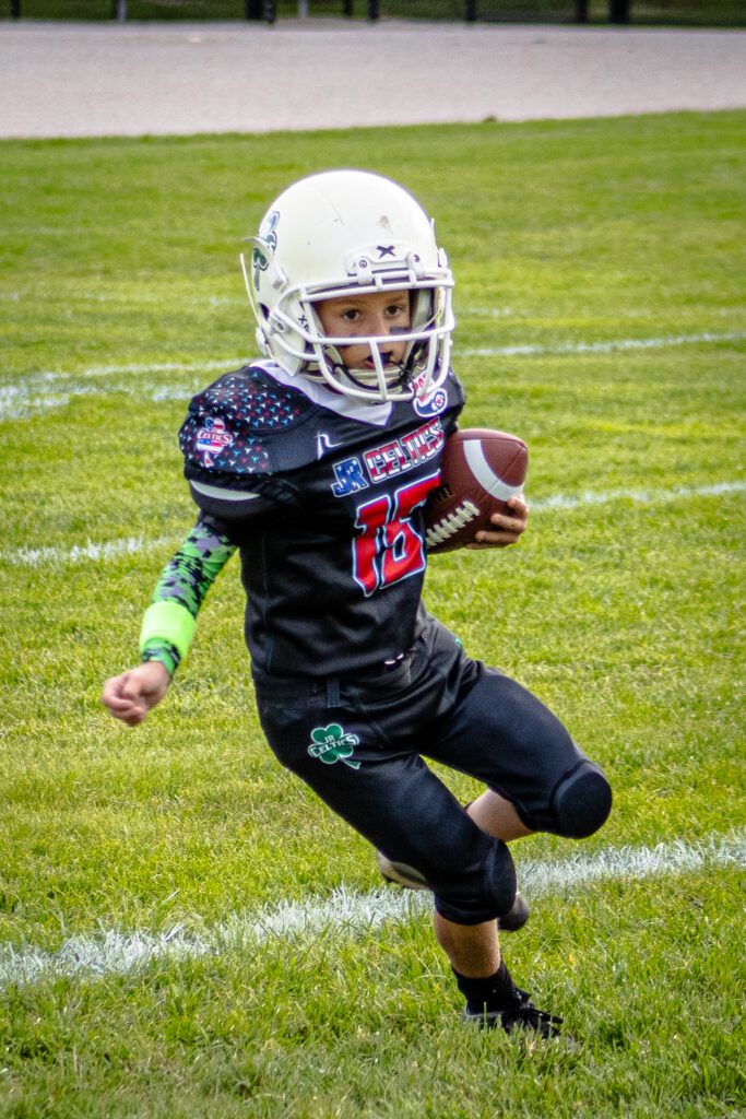As a team, the Jr. Celtic defense played as one, limiting the Saints to a single score. Several players racked up tackles in the game considering these short games with a running clock speed by.