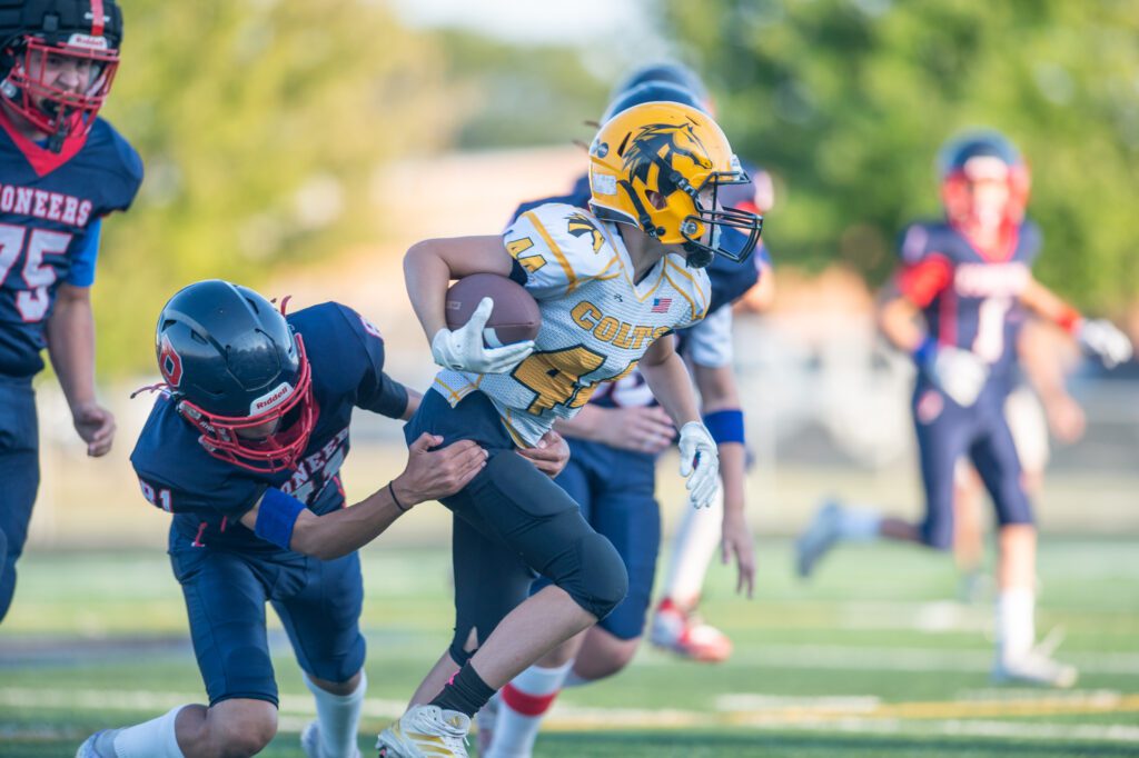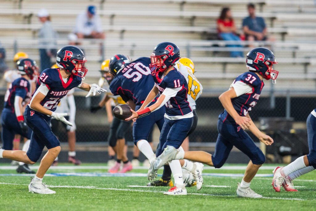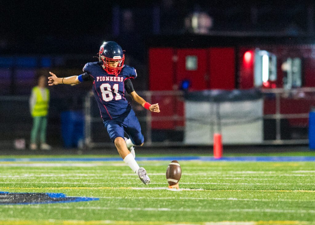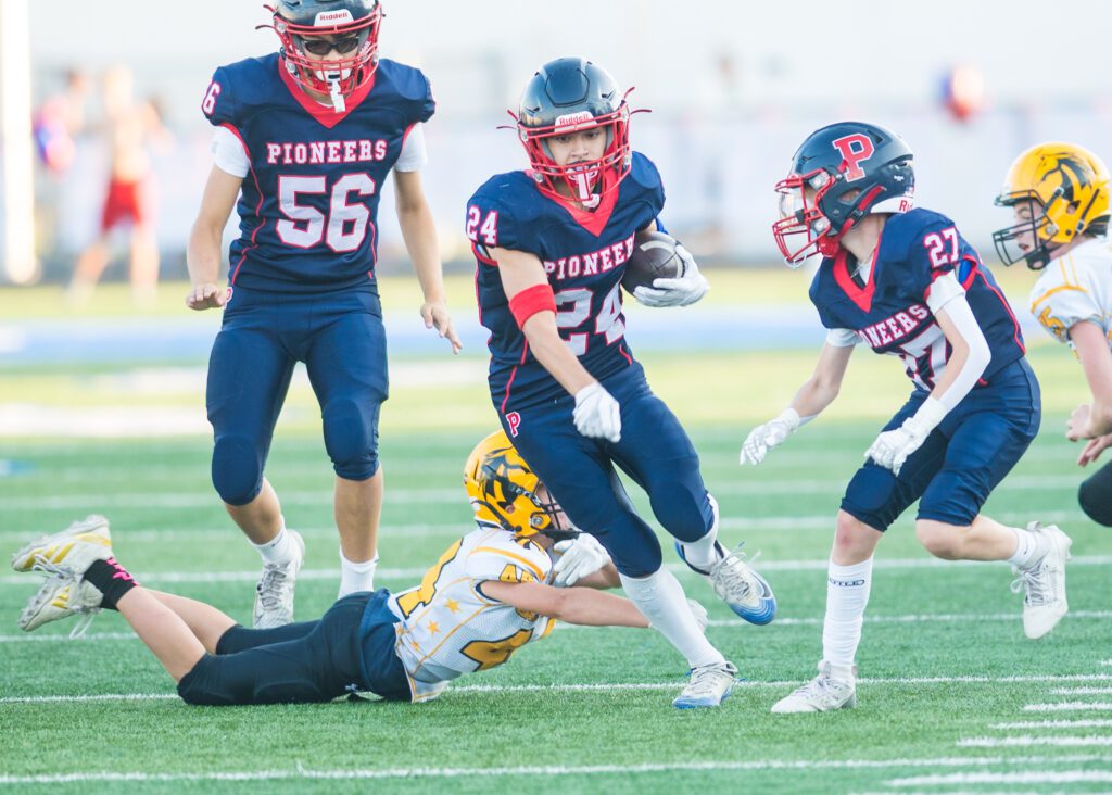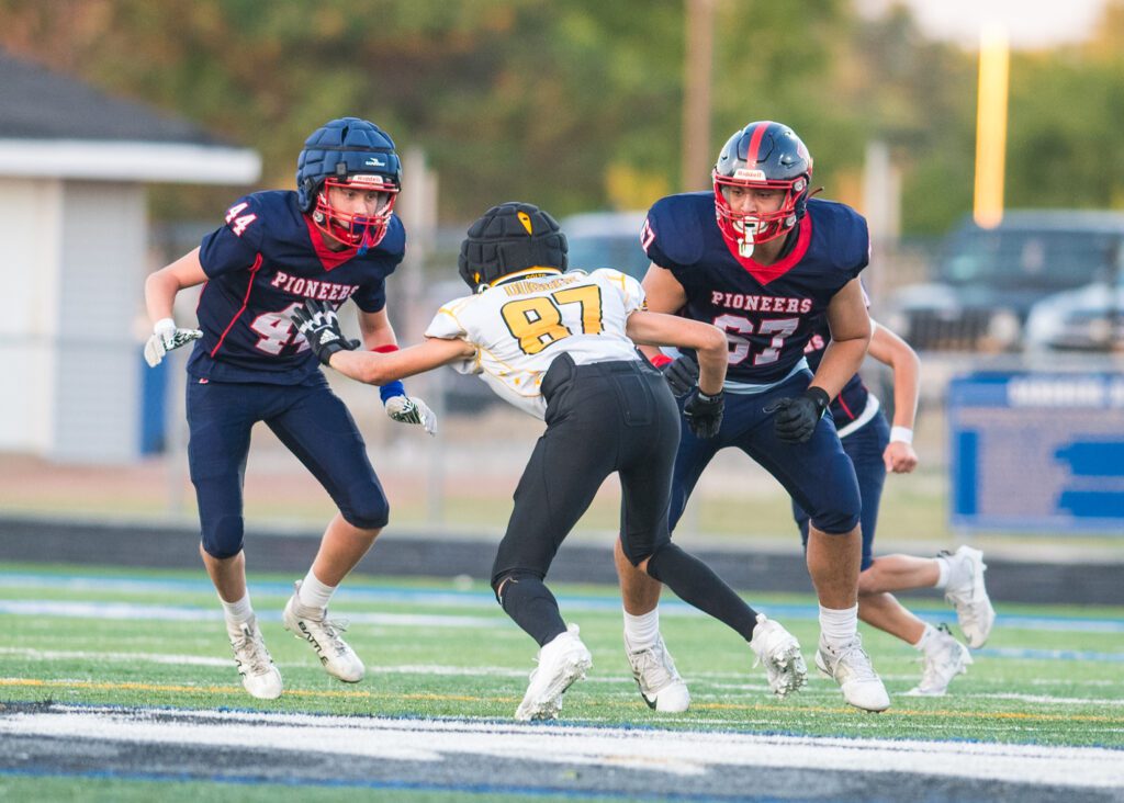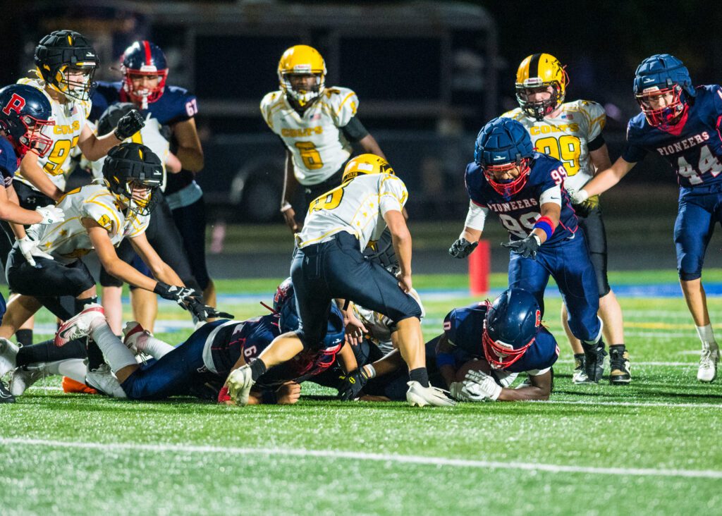 The visiting team had another long drive, but the Pioneers’ defense hung tough to stop the possession on downs. Aidan Rios had a key tackle while teammate Qais Naser was also in the thick of the action on the drive.