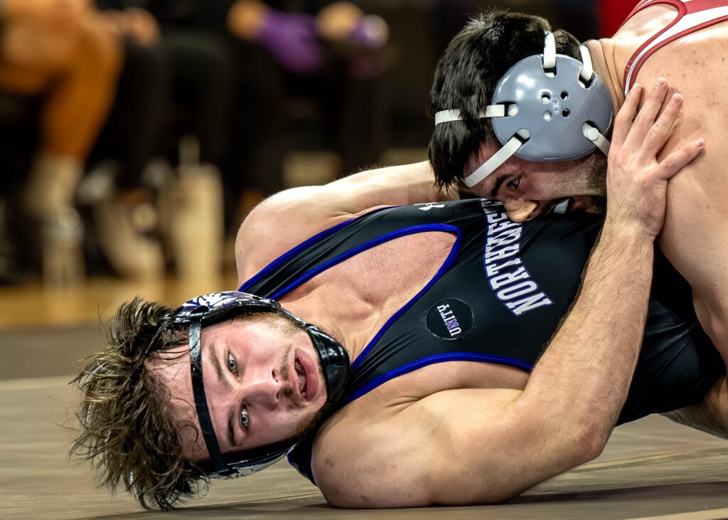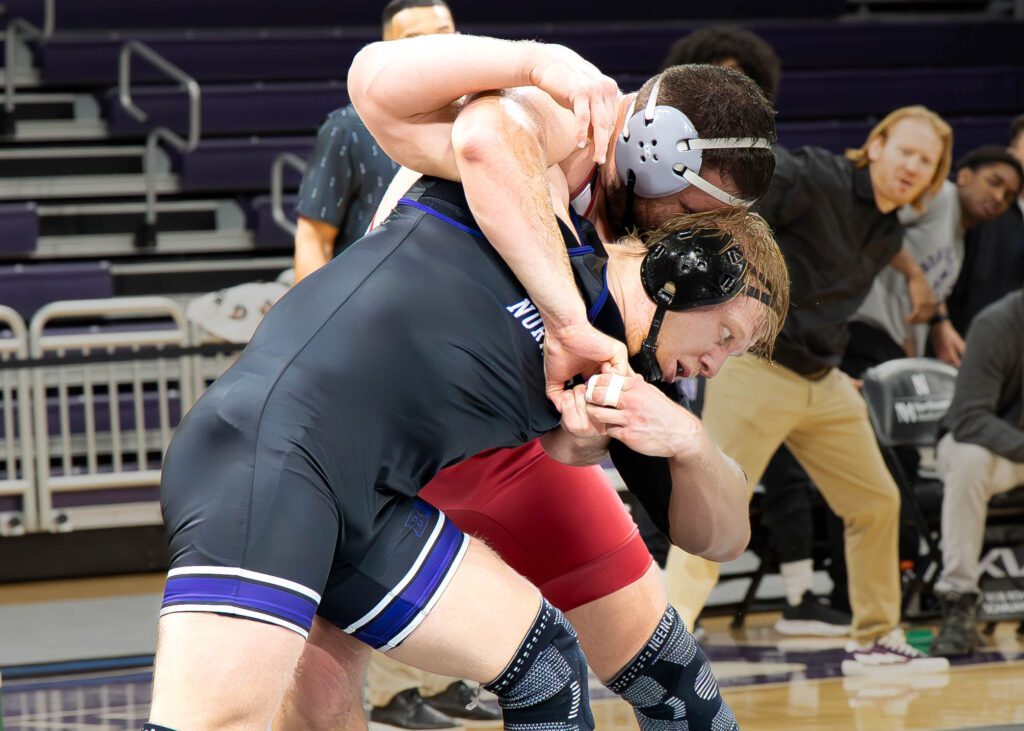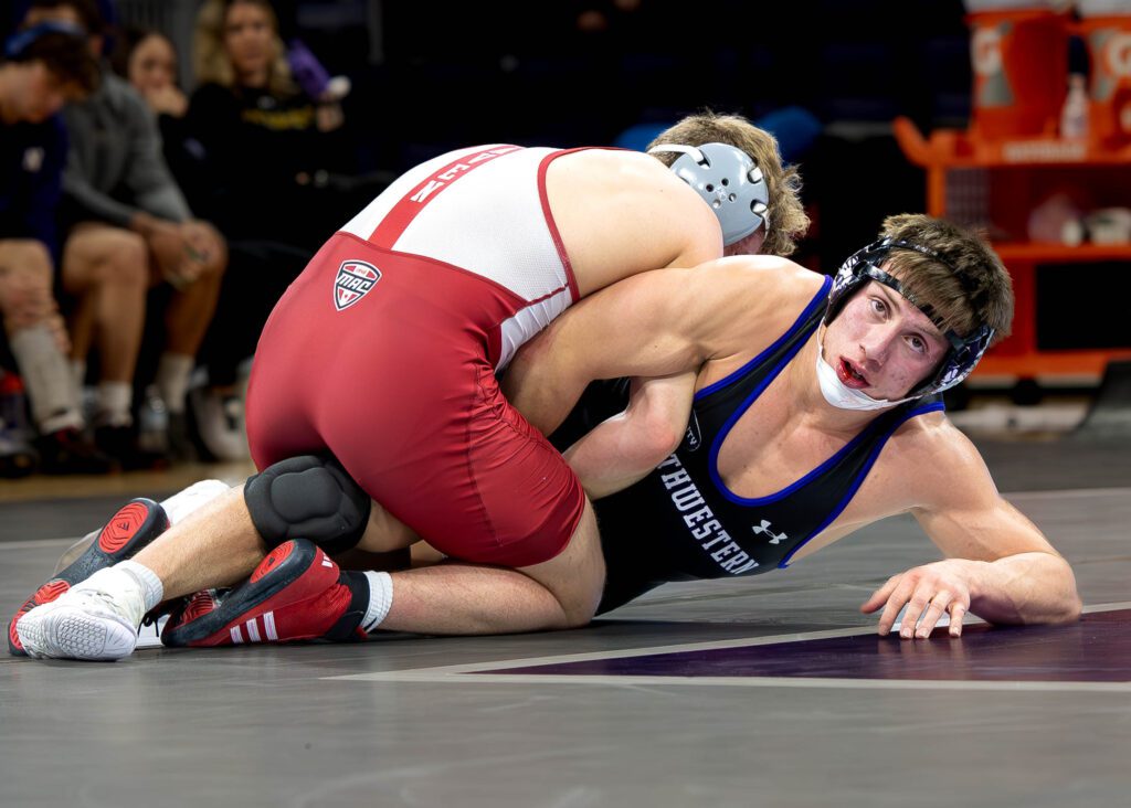 Lock Haven’s Nick Stampoulos out-dualed Northwesterns’ Gunnar Myers with a 5-2 decision at 157 lbs heading to the break with Northwestern up 9-7 in the team score.