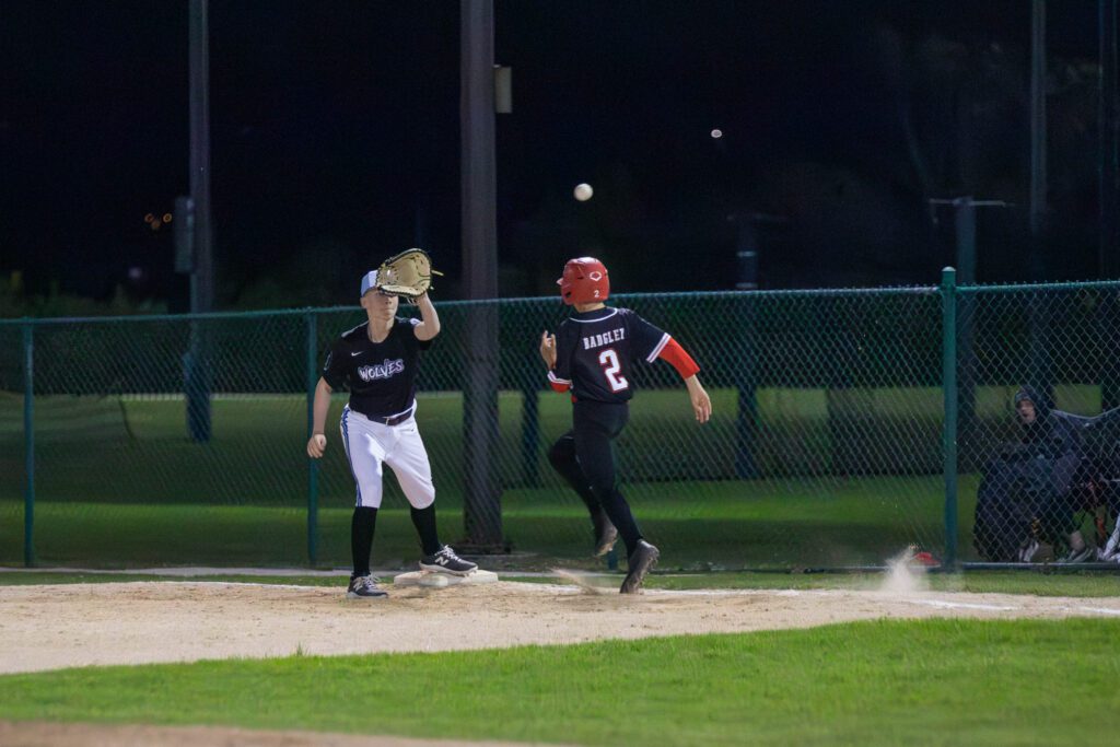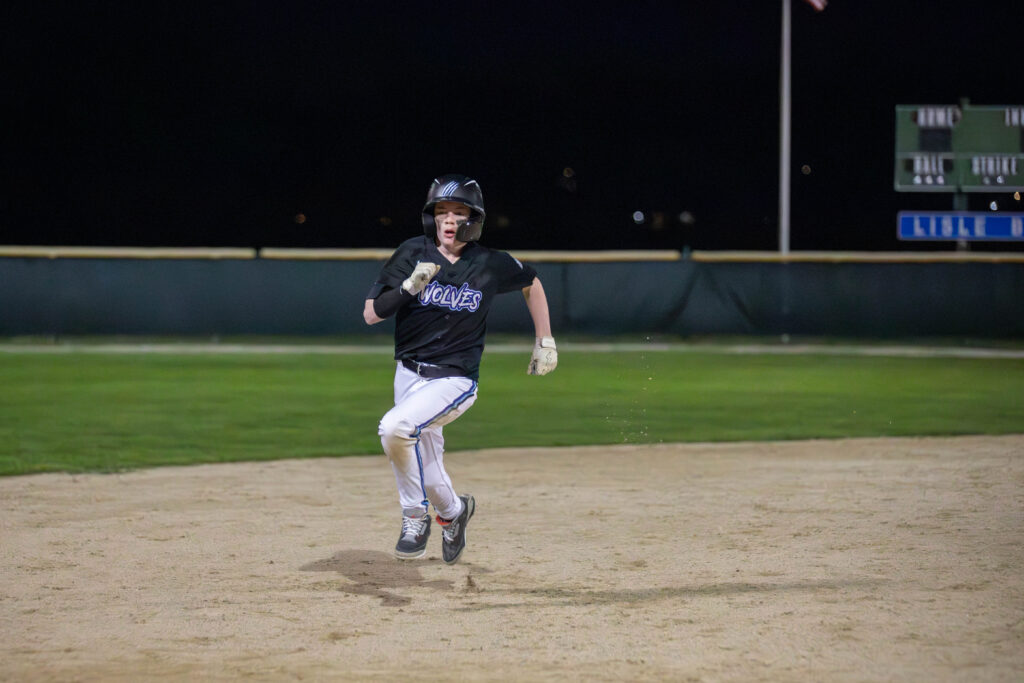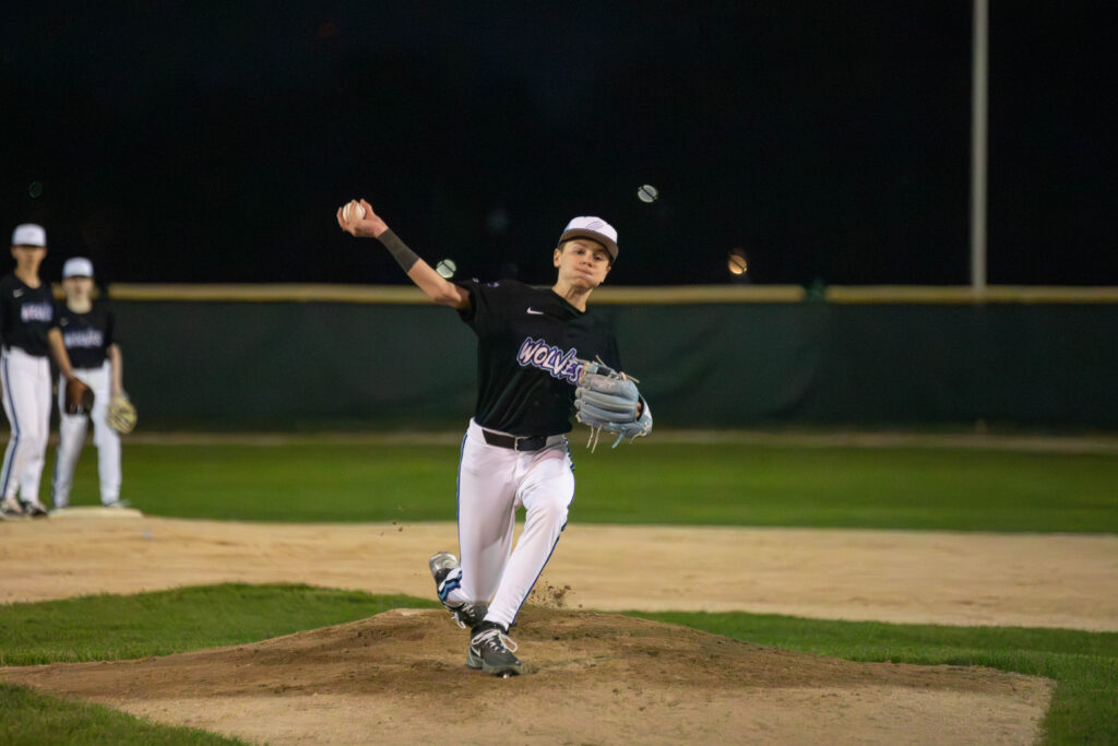Graham Johnson next headed to the mound for the Wolves. Although he gave a hit and walked two Lightning batters to load the bases with one out, he coaxed a hit back at him as he started the 1-2-3 double play to end the Lightning threat.